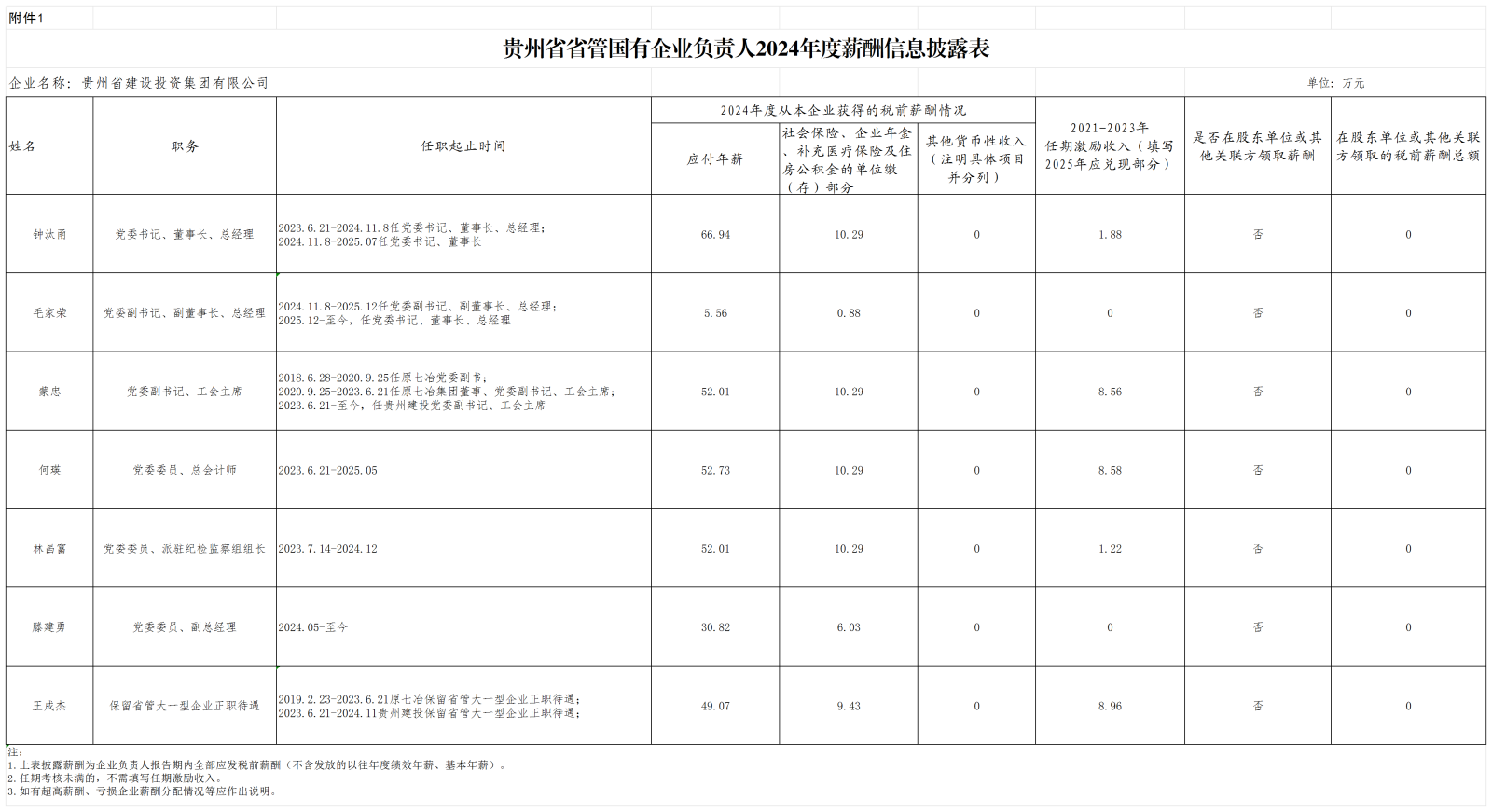 贵州省省管国有企业负责人2024年度薪酬信息披露表